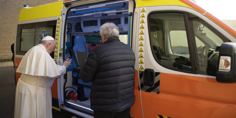 A ambulância foi abençoada pessoalmente pelo Papa Francisco antes de partir para a Ucrânia.