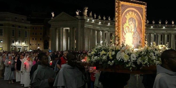Como aconteceu no primeiro sábado (7) do mês, a oração do terço com a procissão com velas na Praça São Pedro com a imagem da Mater Ecclesiae irá se repetir pelos próximos sábados de outubro. O encontro dos fiéis será realizado sempre às 21 horas locais e faz parte das iniciativas da Basílica de São Pedro durante a XVI Assembleia Geral do Sínodo dos Bispos.