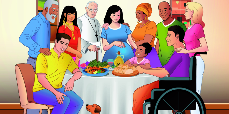Cartaz tem representação do Papa Francisco em referência à Encíclica Fratelli Tutti, inspiração do tema da campanha.