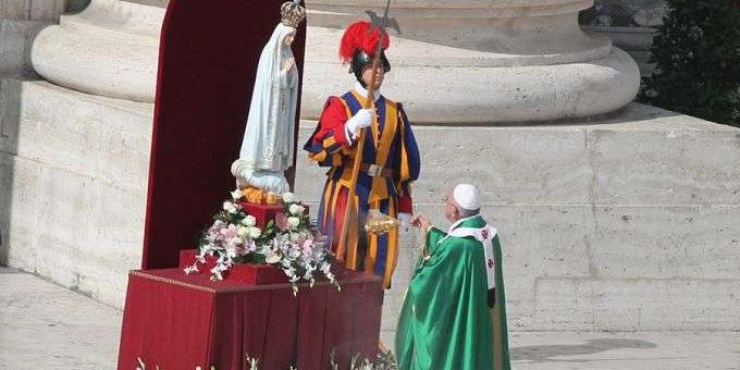 Diante de aproximadamente 100 mil pessoas presentes na praça de São Pedro, em 13 de outubro de 2013, o papa Francisco consagrou o mundo à proteção de Nossa Senhora de Fátima.