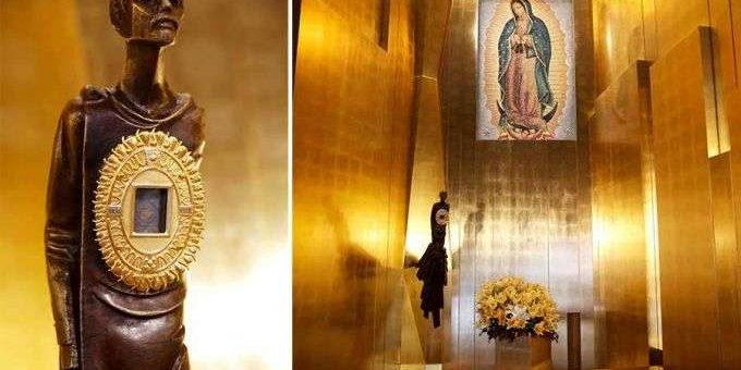 O fragmento da tilma é conservado dentro de um relicário de ouro, incrustrado no coração de uma escultura de São Juan Diego.