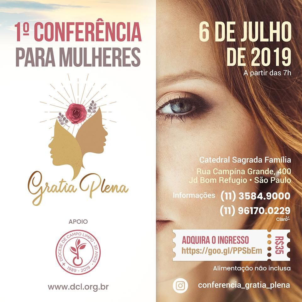 Em comemoração aos 30 anos da nossa Diocese de Campo Limpo, queremos convidar todas as mulheres para participar da 1° Conferência para Mulheres Gratia Plena que será realizada no dia 6 de julho, a partir das 7h, na Catedral da Sagrada Família.