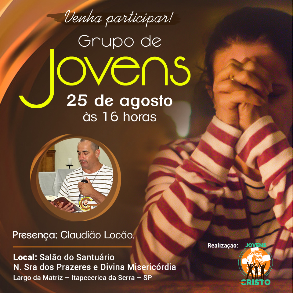 Convidamos você para participar do Grupo de Jovens que acontecerá no dia 25 de agosto de 2019 as 16:00, no Salão Paroquial do Santuário de Nossa Senhora dos Prazeres e Divina Misericórdia.