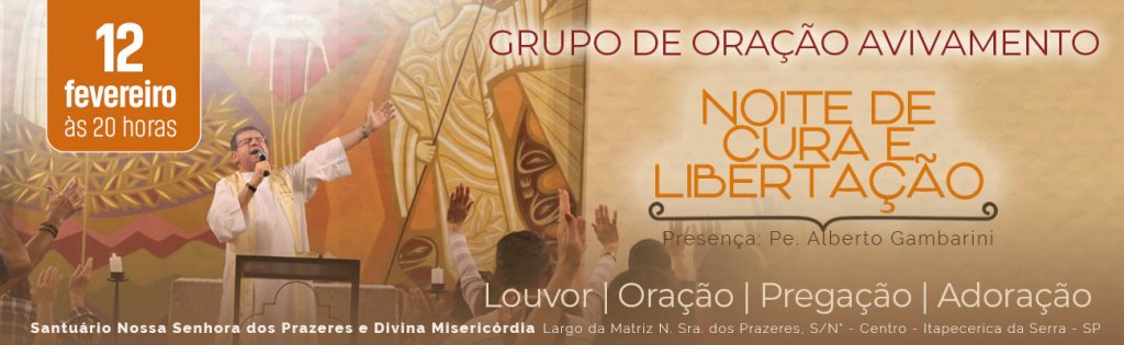 Venha participar de uma noite de cura e libertação com o padre Alberto Gambarini, dia 12 de fevereiro, às 20h, no Santuário Nossa Senhora dos Prazeres e Divina Misericórdia em Itapecerica da Serra –SP.