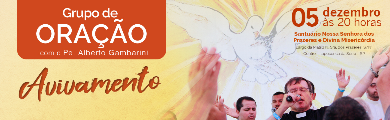 Nesta quarta-feira, dia 05 de dezembro, venha participar do GRUPO DE ORAÇÃO AVIVAMENTO que será conduzido por padre Alberto Gambarini, às 20h, no Santuário Nossa Senhora dos Prazeres e Divina Misericórdia. Noite de louvor, com pregação da palavra e oração de cura.