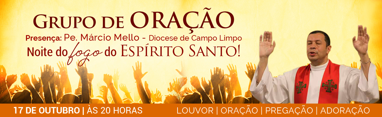 No dia 17 de outubro (quarta-feira), o Grupo de Oração será conduzido pelo padre Márcio Mello, às 20h, no Santuário Nossa Senhora dos Prazeres e Divina Misericórdia. Será uma noite do fogo do Espírito Santo!