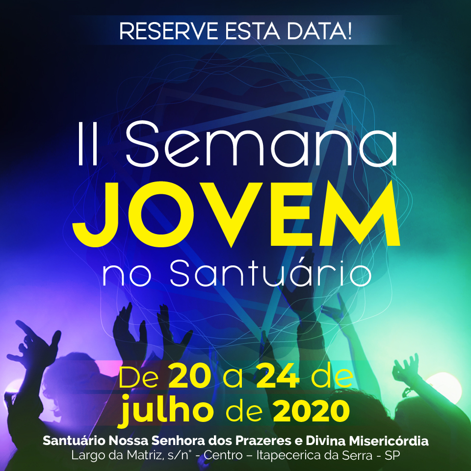 A Semana Jovem acontecerá de 20 a 24 de julho de 2020, sempre a partir das 20 horas, no Santuário Nossa Senhora dos Prazeres e Divina Misericórdia em Itapecerica da Serra, SP.