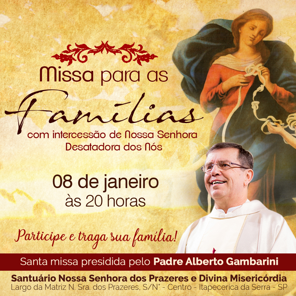 A primeira Missa Para as Famílias do Santuário Nossa Senhora dos Prazeres e Divina Misericórdia de 2020 será celebrada nesta quarta-feira, 08 de janeiro, às 20h com o Padre Alberto Gambarini!