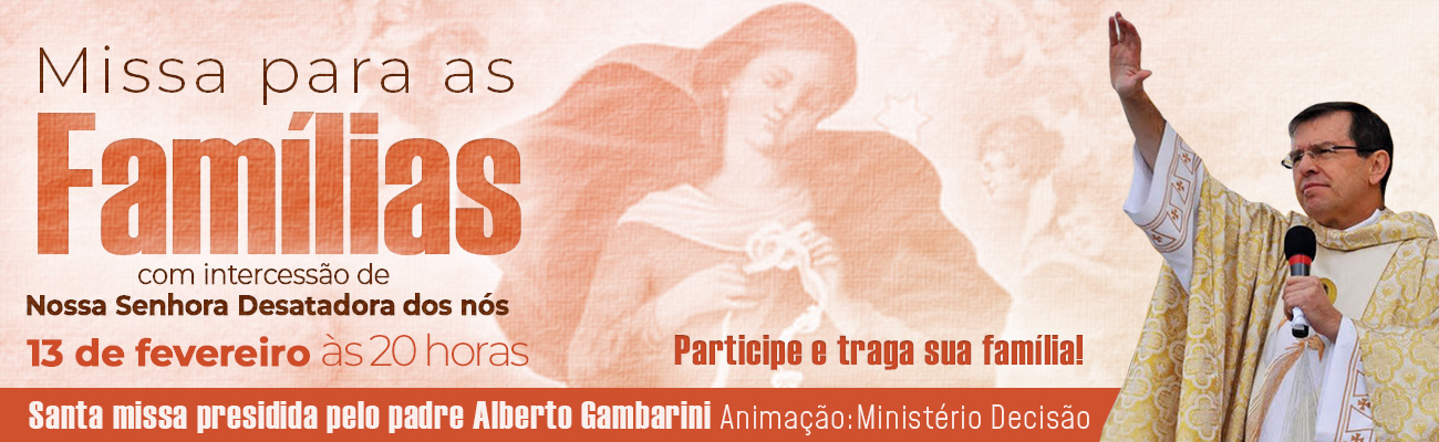 Nesta quarta-feira (13 de fevereiro), a Santa Missa para as Famílias com a intercessão de Nossa Senhora Desatadora de Nós será presidida pelo padre Alberto Gambarini às 20h, no Santuário Nossa Senhora dos Prazeres e Divina Misericórdia.