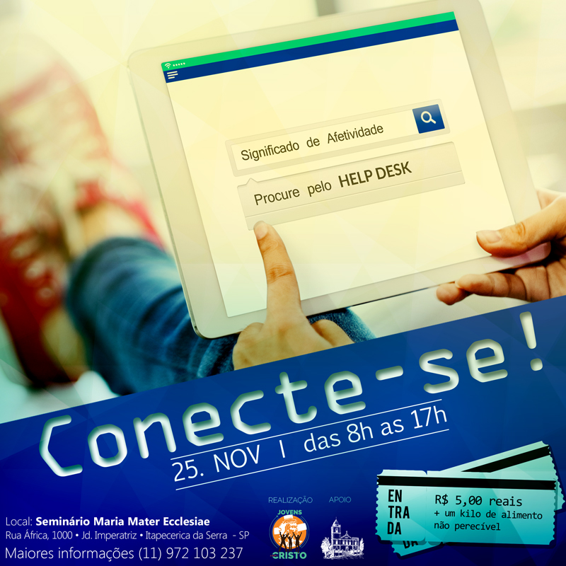 O grupo Jovens com Cristo irá realizar o Retiro Afetividade com o tema ‘Conecte-se’ no dia 25 de novembro, das 8h às 17h, no Seminário Maria Mater Ecclesiae, localizado na rua África, 1000 – Jardim Imperatriz em Itapecerica da Serra – SP.