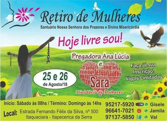 O Santuário Nossa Senhora dos Prazeres e Divina Misericórdia realizará um Retiro de Mulheres de 25 a 26 de agosto, com início no sábado às 8h e término no domingo às 14h. O evento com o tema “Hoje livre sou!”, contará com as presenças da pregadora Ana Lúcia e Sara. Garanta sua vaga e faça já a inscrição. Para mais informações entre em contato com a equipe: Gisele (11) 95217-5920, Jamila (11) 96641-7021 ou Val (011) 97137-5850.