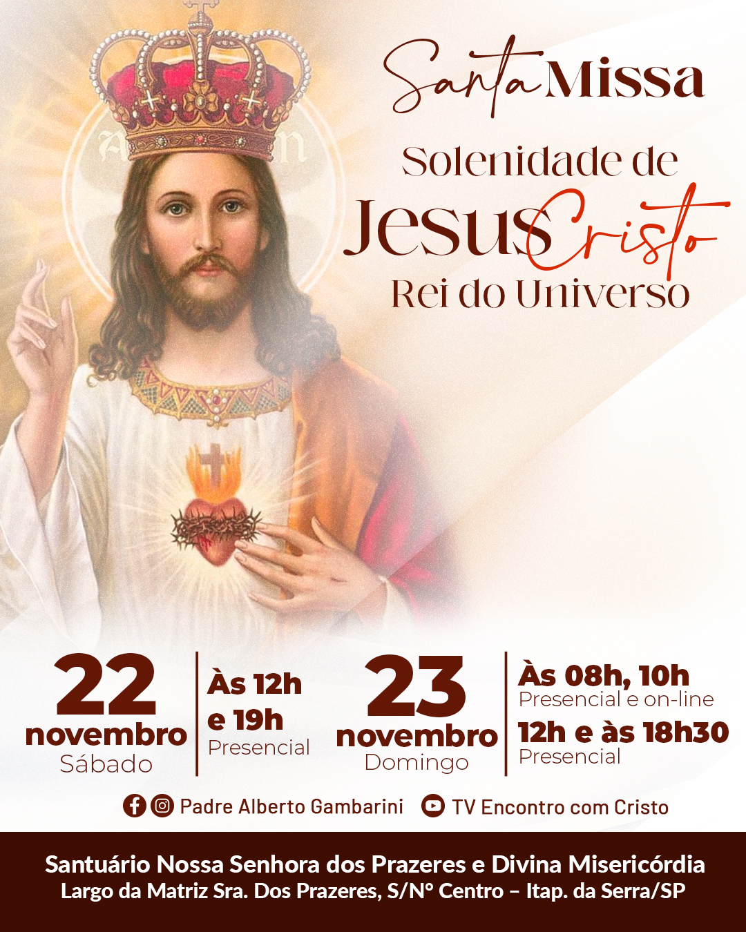 Santa Missa: Solenidade de Jesus Cristo, Rei do Universo – 12h e às 19h