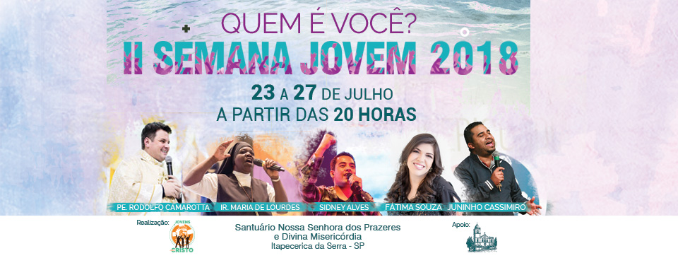 O grupo “Jovens Com Cristo” realizará a II Semana Jovem de 23 a 27 de julho, sempre à partir das 20h, no Santuário Nossa Senhora dos Prazeres e Divina Misericórdia em Itapecerica da Serra, SP.