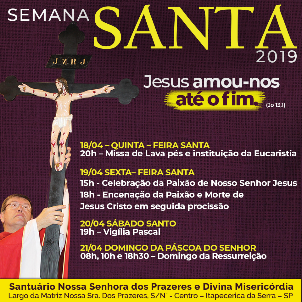 O Santuário Nossa Senhora dos Prazeres e Divina Misericórdia convida você para participar da Semana Santa que começa no Domingo de Ramos, 14, com a Missa Campal às 9h, em frente ao Santuário. E termina no Domingo da Páscoa do Senhor, 21, com missas às 8h, 10h e 18h30.