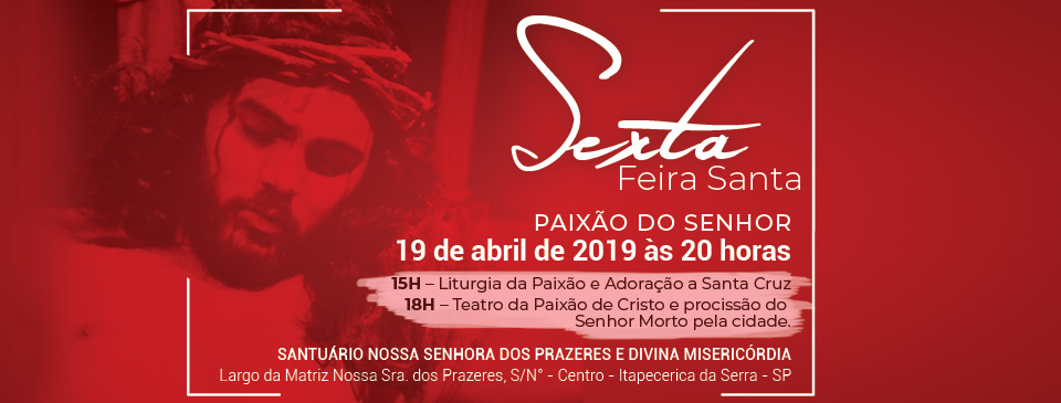 O Santuário Nossa Senhora dos Prazeres e Divina Misericórdia convida você para participar da Sexta-feira Santa: Paixão do Senhor no dia 19 de abril, a celebração começa às 15h, com a Liturgia da Paixão e Adoração a Santa Cruz; e mais tarde às 18h será realizado o Teatro da Paixão de Cristo e a procissão do Senhor morto pela cidade.