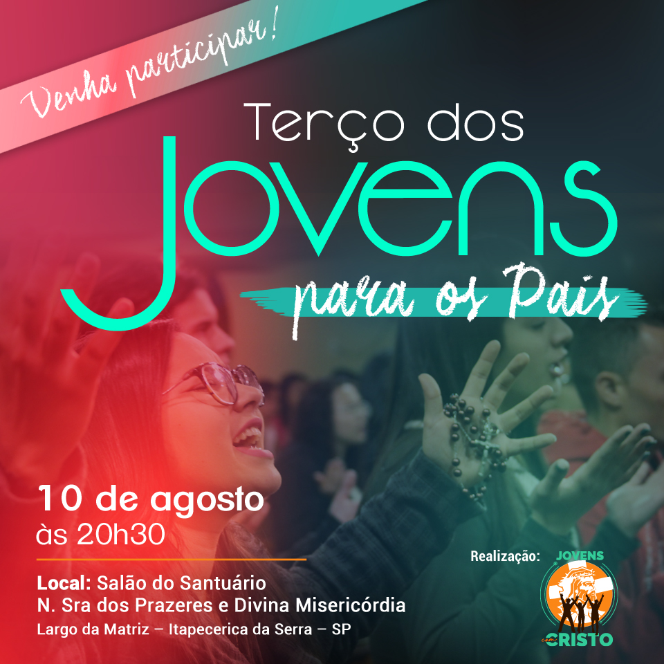 No dia 10 de Agosto de 2019 (sábado) as 20h30 após a Missa. Será realizado o Terço de Jovens para os pais no Salão Paroquial do Santuário de Nossa Senhora dos Prazeres e Divina Misericórdia.