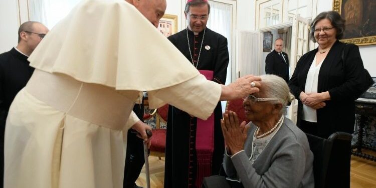 Um dos momentos emocionantes que marcou a visita do Santo Padre à capital portuguesa foi um encontro em 4 de agosto de 2023, na Nunciatura Apostólica, onde o Papa recebeu Maria da Conceição Brito Mendonça, nascida no dia das aparições de Fátima, em 13 de maio de 1917.