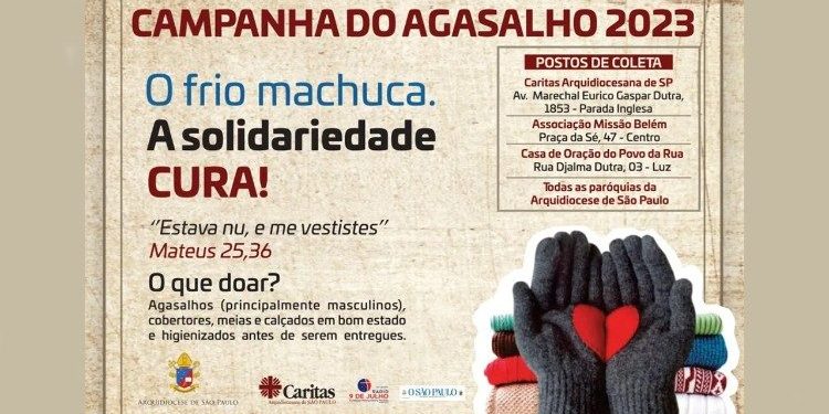 Também a Pastoral do Menor da Arquidiocese de São Paulo realiza até 27 de julho a campanha do agasalho 2023, com o tema “Doar aquece o coração de quem doa e de quem recebe”, com postos de arrecadação em colégios católicos, na Catedral da Sé e na própria sede da pastoral (Praça da Sé, 184, 4o andar – conjunto 401). Outras informações podem ser vistas nas redes sociais (pastoraldomenorarquisp) ou obtidas pelo telefone (11) 3105-0722.