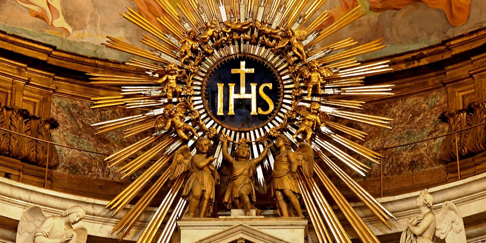 São Bernardino costumava carregar uma pequena imagem que mostrava a Eucaristia com raios saindo dela e, no meio, via-se o monograma “IHS”, abreviação do Nome de Jesus em grego (ιησουσ).