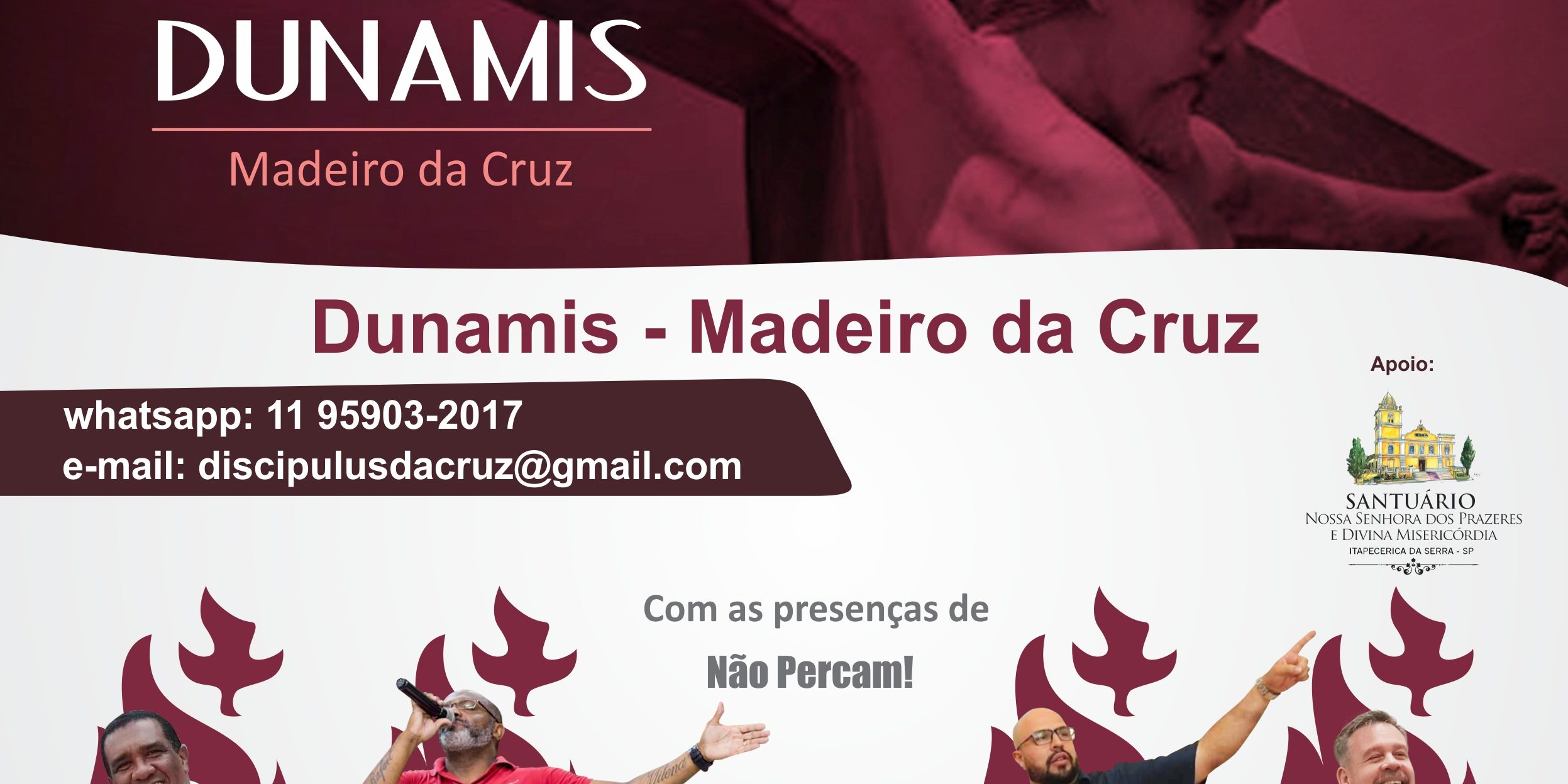 Com o apoio do Santuário Nossa Senhora dos Prazeres e Divina Misericórdia, o Movimento Discípulos da Cruz realizará, no dia 16 de fevereiro de 2020, a primeira edição do retiro Dunamis Madeiro. Será no Colégio 8 de Maio, na Av. Eduardo Roberto Daher, 94, bairro do Potuvera em Itapecerica da Serra – SP, das 07h às 19h.