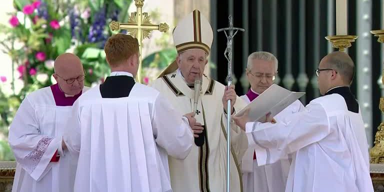 Cerca de 100 mil fiéis participaram da cerimônia, que pôde finalmente ser celebrada na Praça, após dois anos de pandemia, com os tradicionais enfeites florais para acolher o anúncio da ressurreição de Cristo.