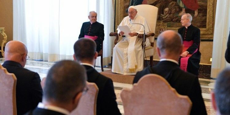 O Papa iniciou seu discurso voltando-se ao Abade da Basílica e aos professores e acadêmicos que vieram a Roma para o Colóquio Ecumênico Paulino. Francisco mencionou a importância dos estudos para o conhecimento bíblico e espiritual e destacou a relevância das palestras em que participam diferentes denominações cristãs: