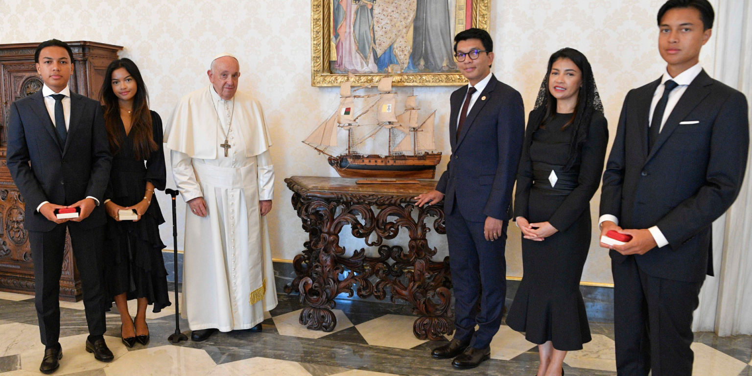 Ao final da audiência privada com o presidente, o Santo Padre convidou a delegação para uma foto ao lado da miniatura do navio que lhe foi oferecida durante sua viagem a Madagascar em 2019. Na sequência, rezaram juntos uma Ave-Maria diante da imagem de Maria, que lhes foi dada pelos bispos malgaxes. O Santo Padre concedeu então a sua bênção aos presentes.