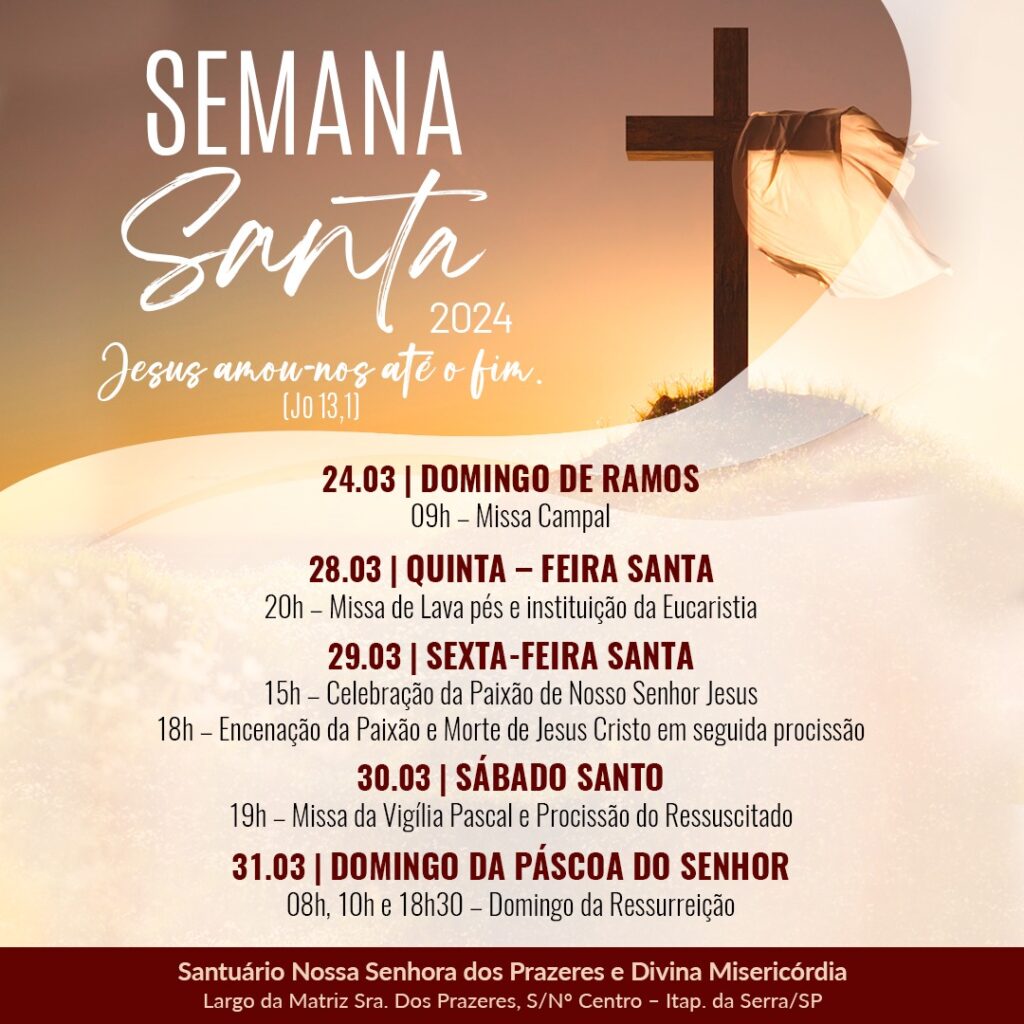 A Semana Santa no Santuário já tem sua programação, que se inicia agora no Domingo de Ramos, 24, e se encerra no Domingo da Páscoa do Senhor, 31 de março. Esta semana é muito importante para nós cristãos, celebramos os acontecimentos mais marcantes do ano litúrgico.