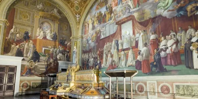 Numa das paredes está representada a Discussão do Dogma e, na parede sul, um afresco mostra o momento da sua proclamação na Basílica de São Pedro.