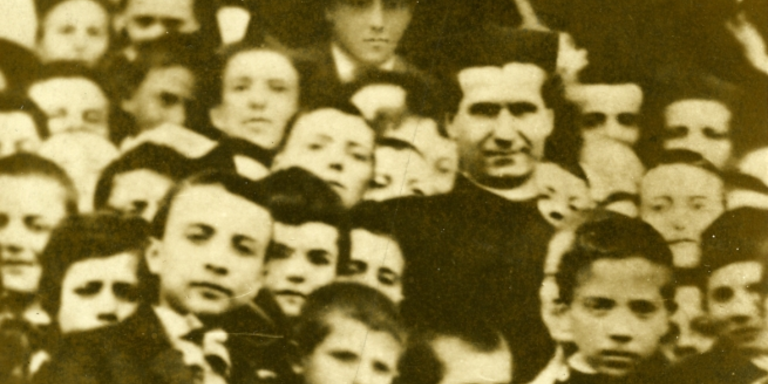Fotografia retrata o santo com alguns jovens salesianos; Imagem é de autoria do ex-aluno, Francisco Serra