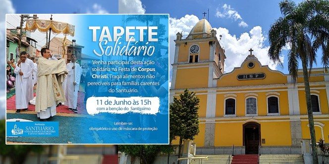 O Santuário Nossa Senhora dos Prazeres e Divina Misericórdia, em Itapecerica da Serra, realiza nesta quinta-feira (11) o “Tapete Solidário”, para arrecadar alimentos para famílias pobres do município. A iniciativa é uma alternativa à tradicional procissão de Corpus Christi, que não acontecerá neste ano devido à pandemia do novo coronavírus. A orientação do governo do Estado e da própria Igreja Católica local é que os templos ainda não sejam reabertos.